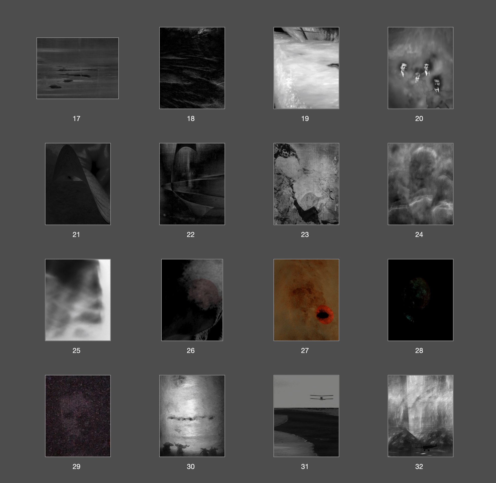 Image abstractions had so far resulted from healing wound photographs as this is the powerful tie between the living and those ancestors from the past. In the current period of reflection, the reading around the Unheimlich or Phantasmagoria, the Weird and the Eerie has had an impact on visual perception. Once triggered the appearance of abstract ghost or landscapes became unavoidable. As a consequence not 100% of abstract ghost images or eerie landscapes have been derived from healing wounds.
